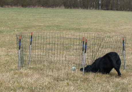 Op een veldje had Jules een hekje neergezet, waar hij een dummy inwierp die de honden moesten apporteren. Het hekje was zo goed gespannen dat de honden er niet onderdoor konden, maar echt over het hekje moesten springen om bij de dummy te komen. Voor de juiste uitvoering van de proef moest de hond netjes naast zijn baasje blijven zitten. Jules gooide een dummy in het hek en kwam terug lopen naar voorjager. Pas op het teken van keurmeester Jules mochten de honden aan het werk. Alle honden is het gelukt om in, en ook weer uit het hekje te komen. Sommige namen de tijd om te bedenken hoe ze het hekje in en uit moesten springen. Andere namen geen tijd en probeerde onder het hek door te kruipen. Dat gaf soms grappige taferelen, waar wij erg om moesten lachen.
